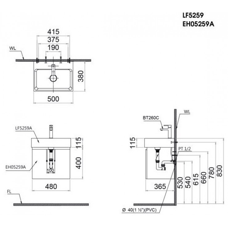- Tủ lavabo treo tường LF5253+ EH05253ATG lắp đặt phù hợp với các vòi sau: B224C, B430CPW, B305C, B460C, B490CP, B370C, B680CT, B150CP…