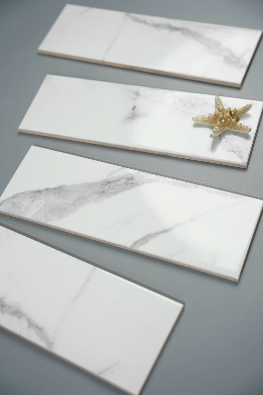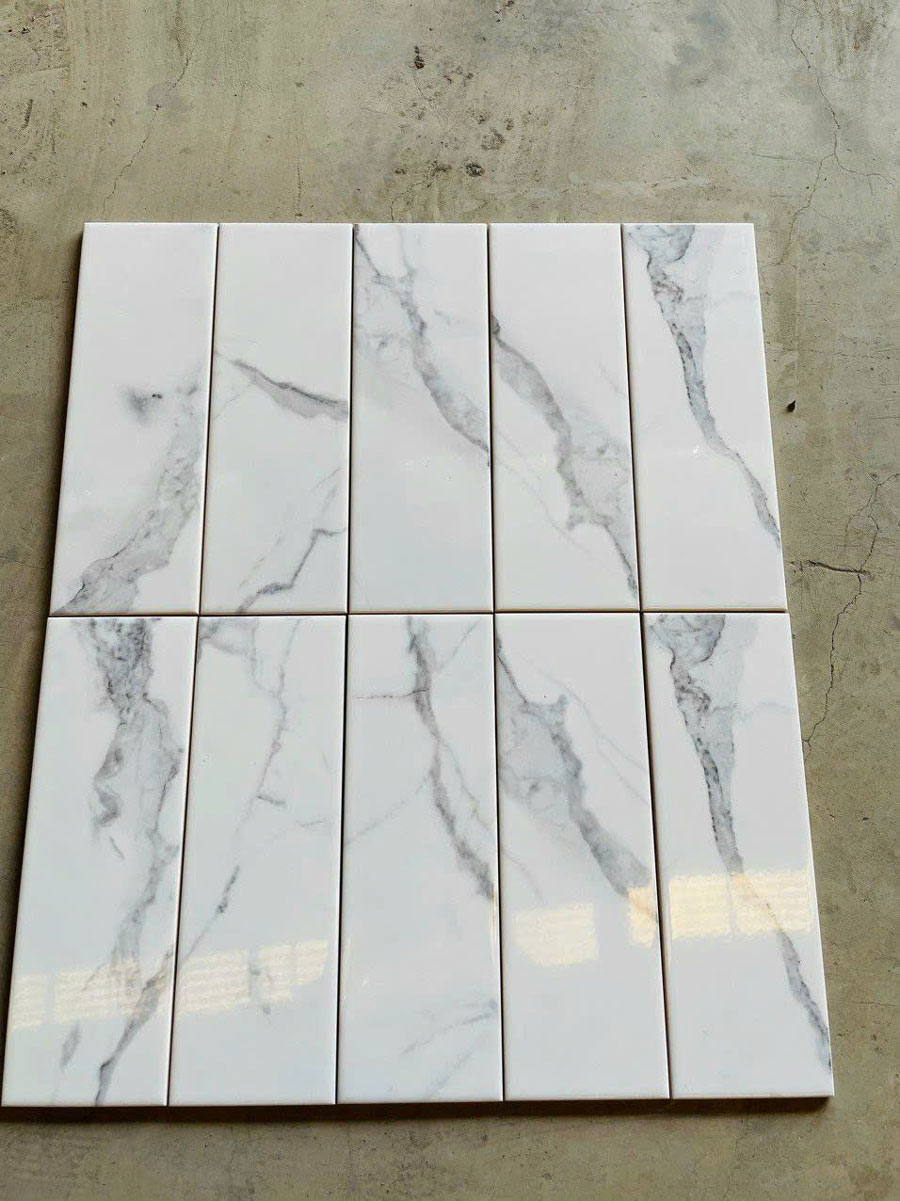 Gạch thẻ 10×30 trắng bóng vân khói,( gạch thẻ ốp tường trắng vân mây), kích thước 100×300 mm một trong những mẫu gạch được ưa chuộng cho không gian bếp và nhà tắm. Với kích thước vừa phải, kiểu dáng hình chữ nhật hiện đại, mẫu gạch sẽ giúp không gian thêm mở rộng và mới mẻ lạ mắt hơn.